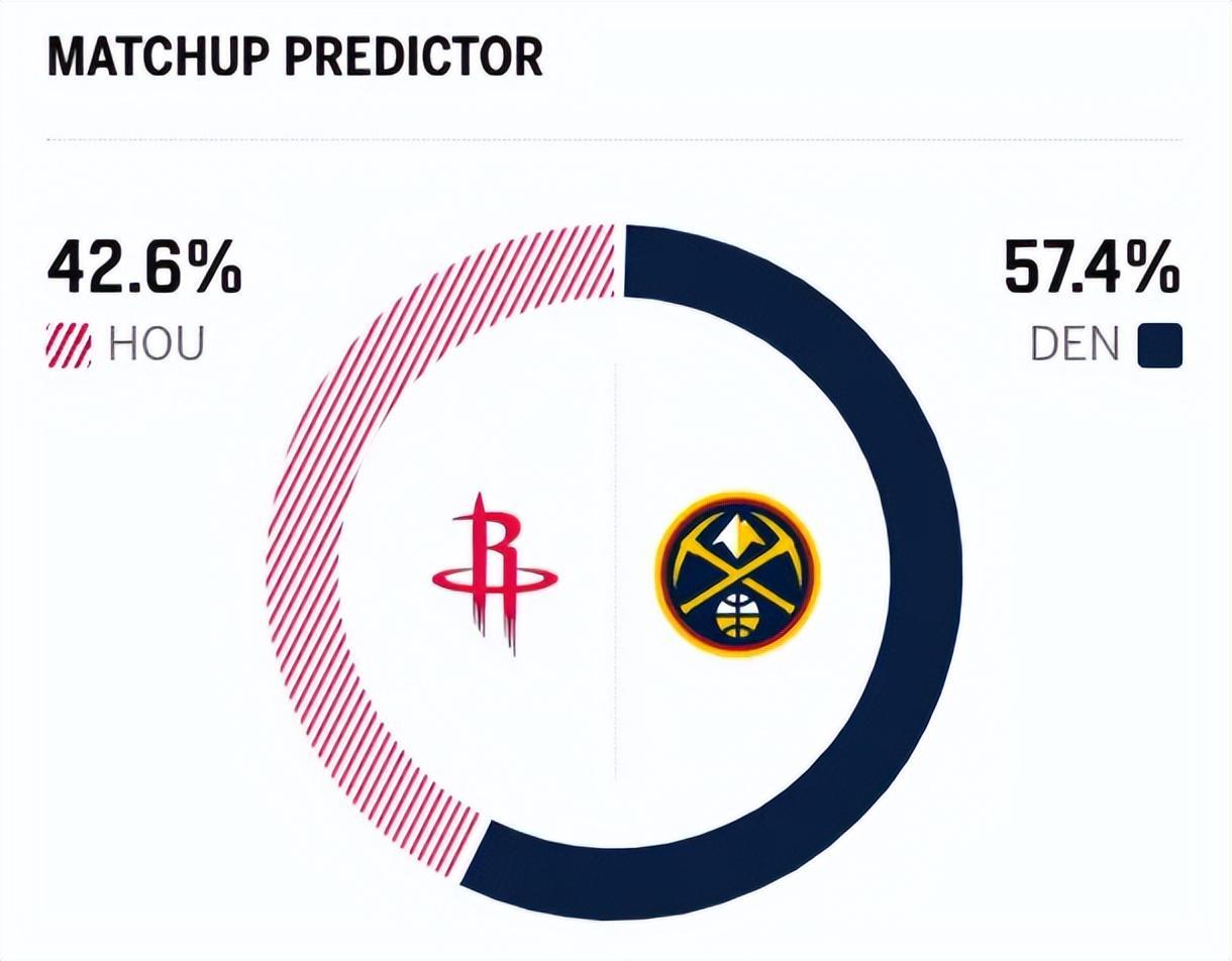 赛前,美媒ESPN对本场比赛进行了胜率预测,火箭队胜率仅有42.6%,掘金胜率则为57.4% ,差距还挺明显。