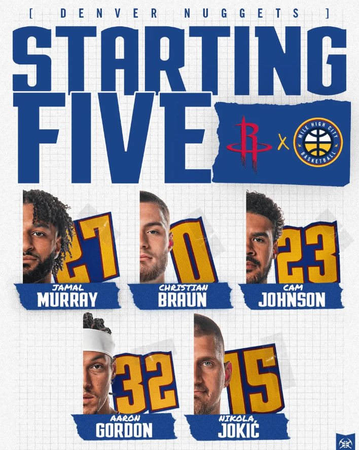 首发阵容方面,掘金队这边,沃特森(腿筋)确认缺阵,主帅排出的最新首发五人组为:贾马尔-穆雷、布劳恩、卡梅隆-约翰逊、阿龙-戈登、约基奇;火箭队这边,范弗利特和亚当斯赛季报销,泰特还是不打,首发阵容为:阿门-汤普森、贾巴里-史密斯、凯文-杜兰特、塔里-伊森、阿尔佩伦-申京。